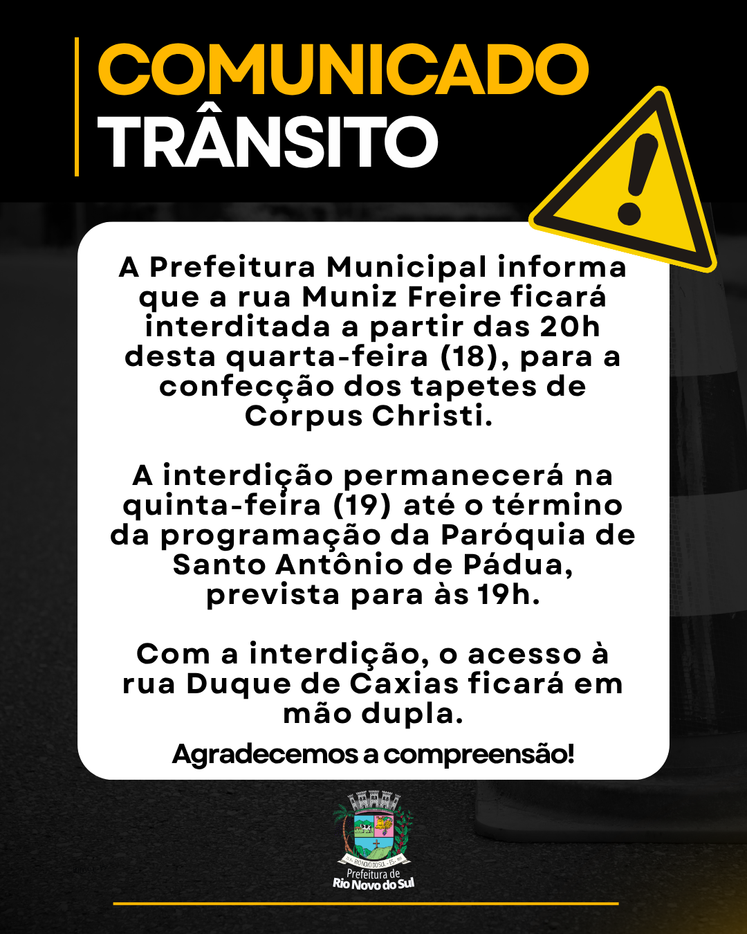 Informamos que a rua Muniz Freire ficará interditada nesta quarta-feira (18), a partir das 20 horas, para a confecção dos tapetes de Corpus Christi. Com isso, a rua Duque de Caxias funcionará com trânsito em mão dupla.