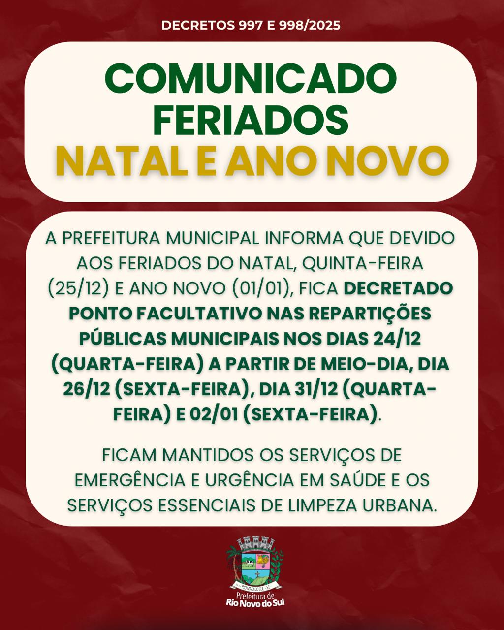 A Prefeitura Municipal informa que devido aos feriados do Natal, quinta-feira (25/12) e Ano Novo (01/01), fica decretado ponto facultativo nas repartições públicas municipais nos dias 24/12 (quarta-feira) a partir de meio-dia, dia 26/12 (sexta-feira), dia 31/12 (quinta-feira) e 02/01 (sexta-feira). Ficam mantidos os serviços emergência e urgência em saúde e os serviços essenciais de limpeza urbana.