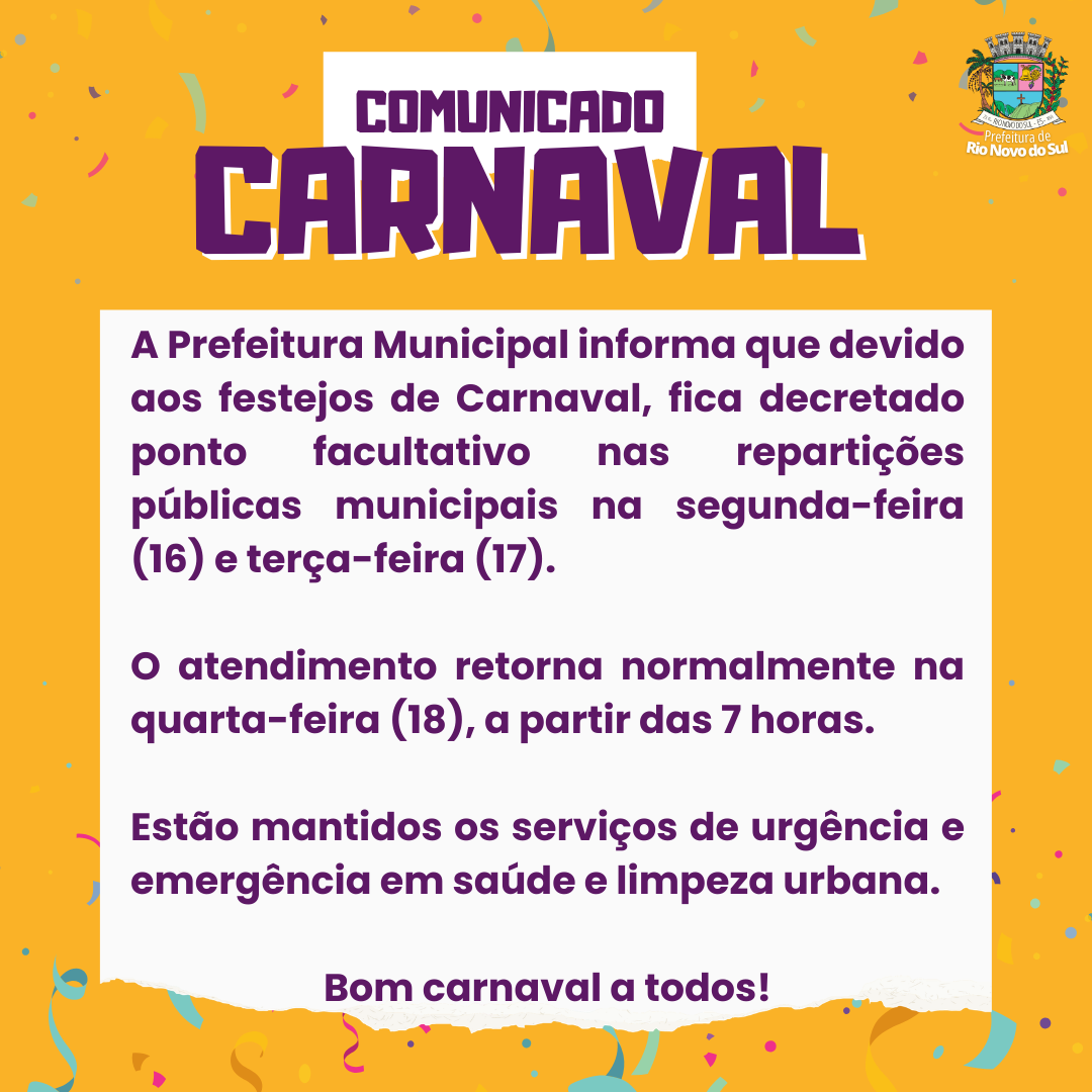 Fique atento para o funcionamento das repartições públicas municipais no Carnaval: