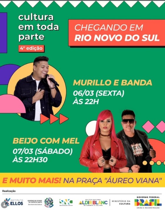Atenção rionovense, nosso municipio recebe nesta semana mais uma edição do projeto" Cultura em Toda Parte"! Serão 10 atividades culturais invadindo a cidade com música, teatro, dança e formações para todos os públicos. A ação conta com o apoio da Prefeitura de Rio Novo do Sul, por meio da Secretaria Municipal de Esportes, Lazer, Turismo e Cultura.