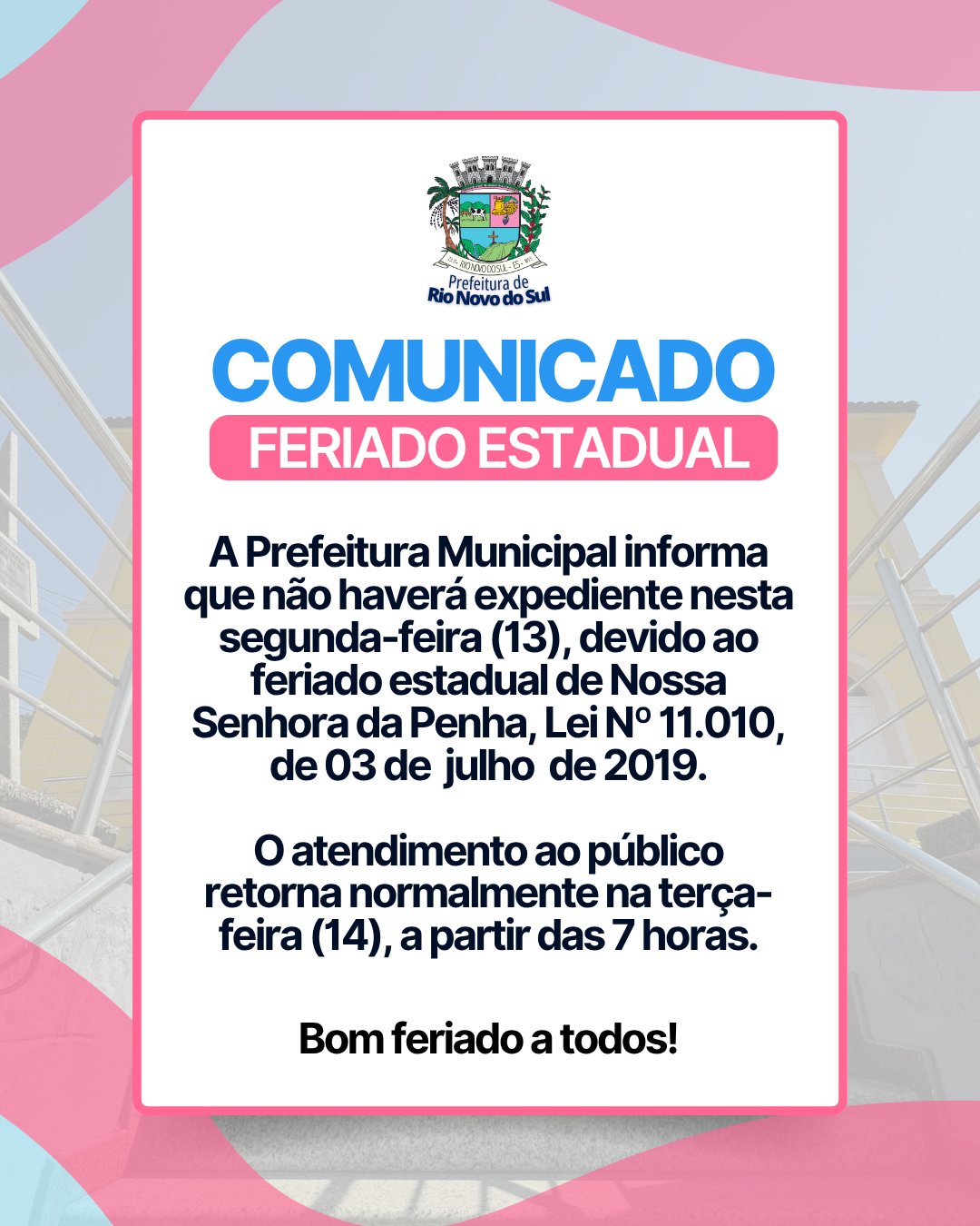 Informamos que devido ao feriado estadual dde Nossa Senhora da Penha, padroeira do Espìrito Santo, Lei Nº 11.010, de 03 de julho de 2019, não haverá atendimento nas repartições públicas municipais nesta segunda-feira (13). Permanecem os servições de emergência e urgência em saúde e limpeza urbana.O atendimento ao público retorna normalmente na terça-feira (14), a partir das 7 horas.